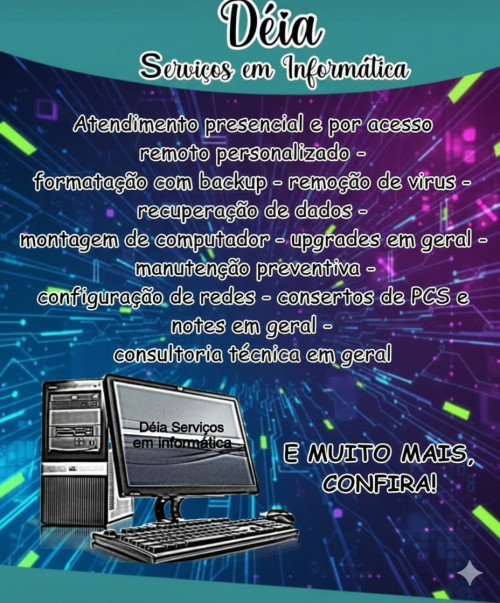 O site criado oferece algumas dicas importantes sobre cuidados básicos com equipamentos, periféricos e conselhos úteis na área de informática e tecnologia, além de contato direto com a própria idealizadora. Déia Serviços em Informática oferece uma ampla gama de serviços de assistência técnica, incluindo a instalação de programas e sistemas operacionais originais, formatação com backup, limpeza geral interna e externa, recuperação de HDs e arquivos em geral, manutenção preventiva e muito mais.